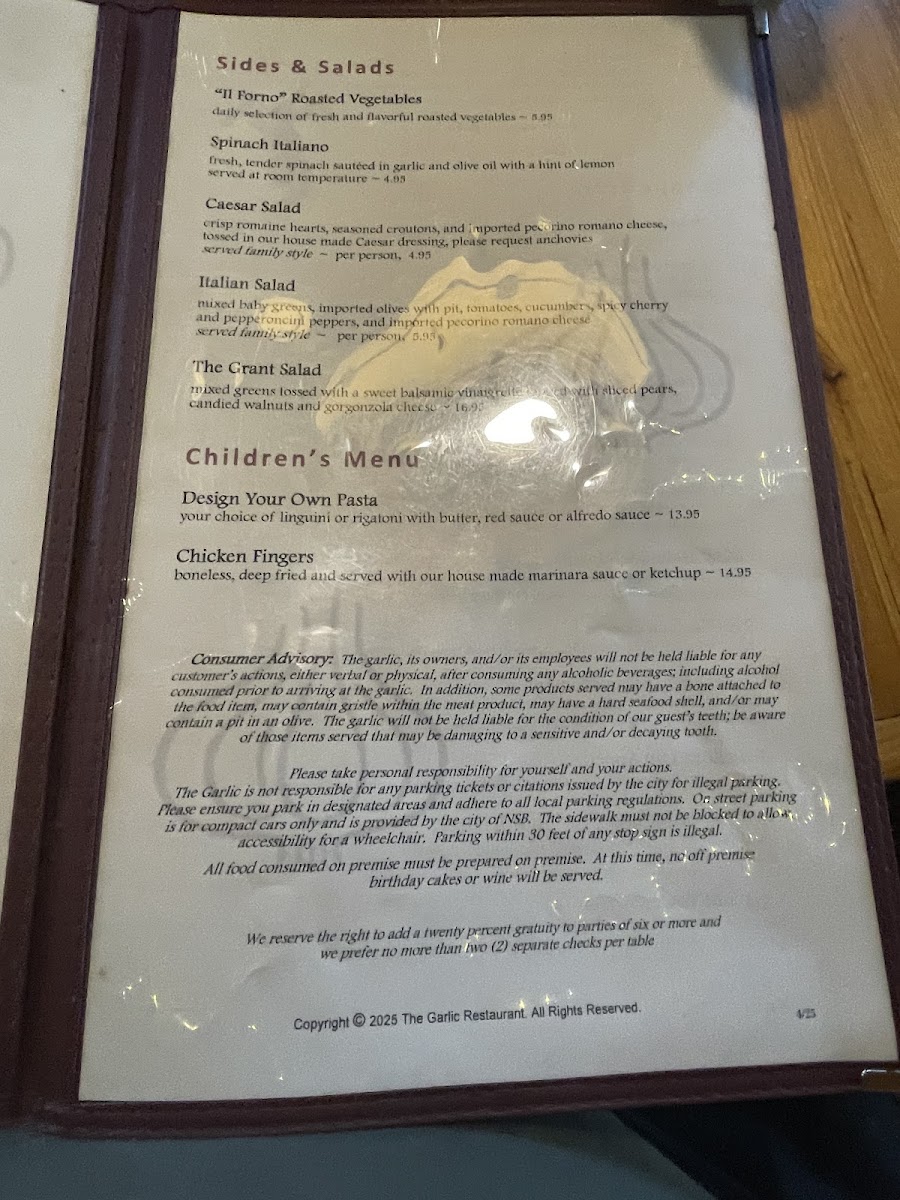 The Garlic offers a thoughtfully curated menu that blends classic Italian cuisine with hearty steakhouse favorites, all set against a lively backdrop of live music. Here, you’ll find dishes designed to complement the warm, inviting atmosphere—perfect for a relaxing evening out or a special celebration.